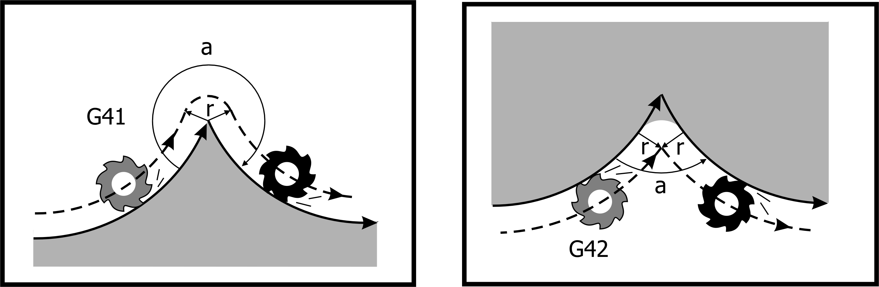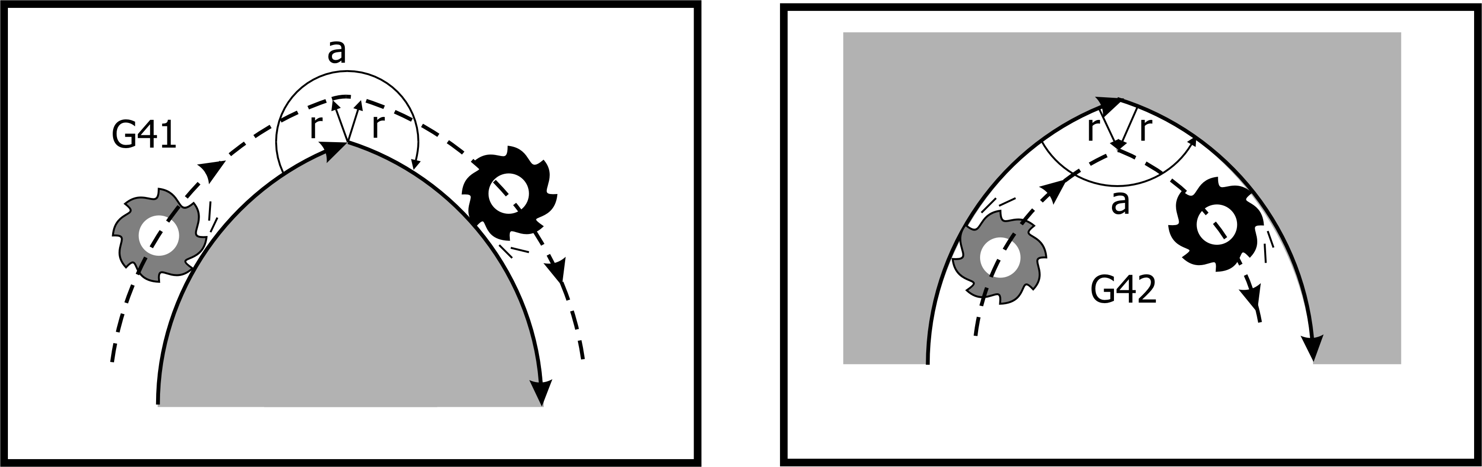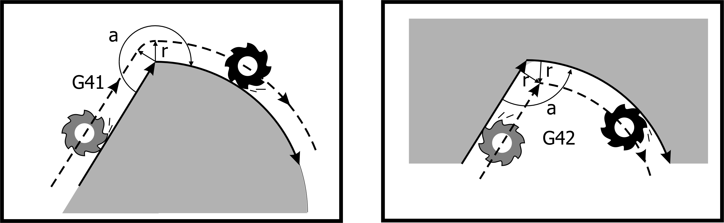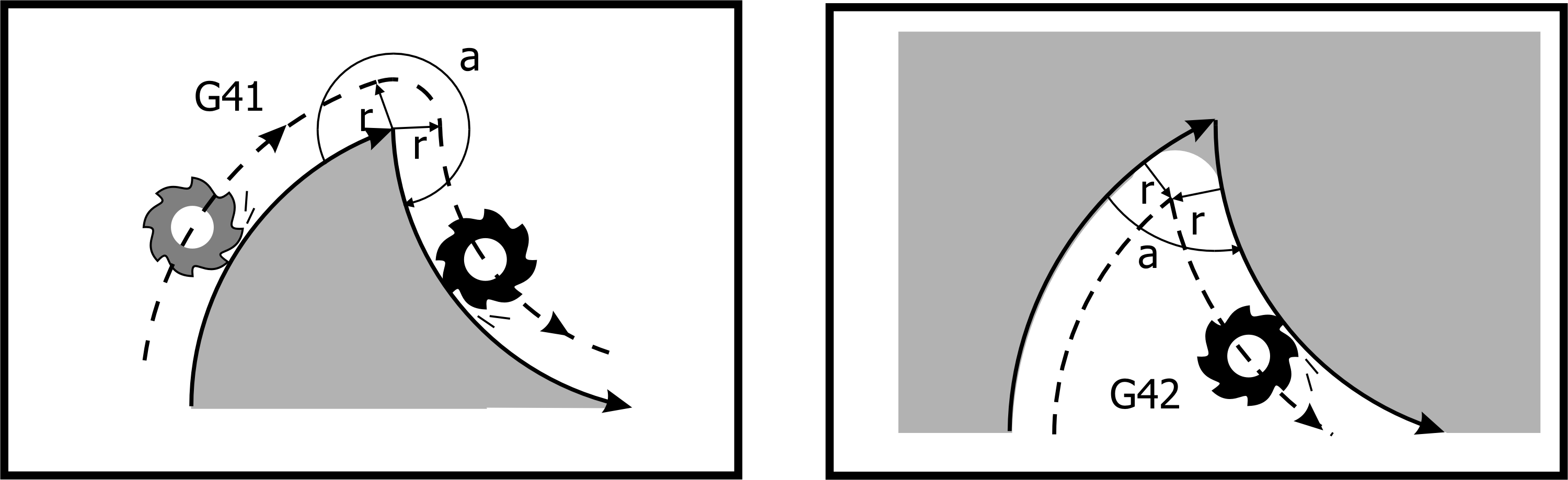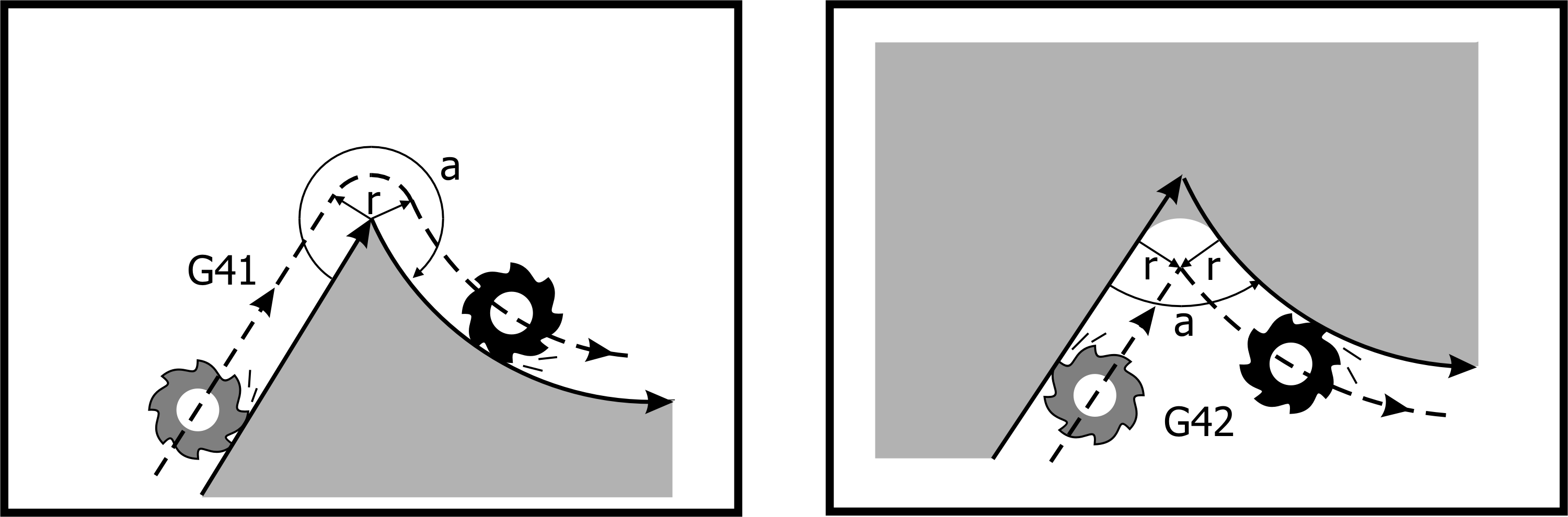 G41/G42 starts tool radius compensation and offsets the tool to the left/right of the starting point of the workpiece contour to be cut. Tool radius compensation left/right deviation judgement is based on the following definition: In the cutting path of the program, from the direction of cutting advance, the right cutter of the milling cutter is executed with G42 command; if the cutter is left offset, G41 command is used carried out.